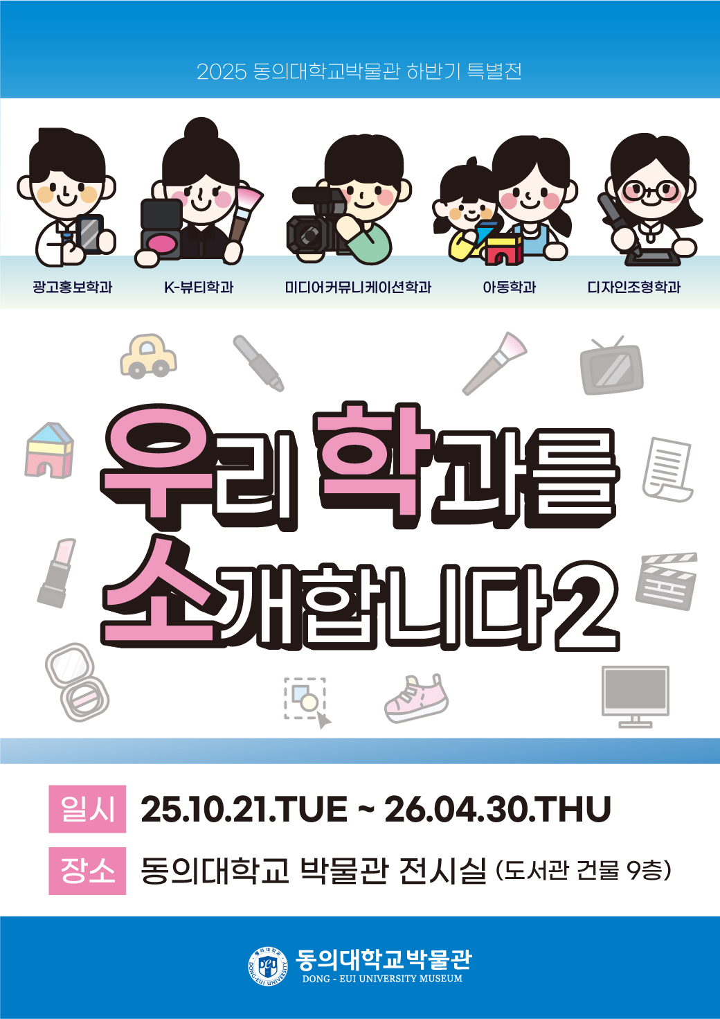 우리 학과는 교내 박물관에서 진행되는 [박물관 특별전] ‘우리 학과를 소개합니다’ 전시에 참여합니다. 이번 특별전은 예비 대학생과 신입생에게는 각 학과의 특성과 비전을 소개하고, 재학생에게는 학과에 대한 자부심을 높이는 계기를 마련하고자 기획되었습니다. 특히 이번 전시는 우리 학과의 전문성과 진로 비전을 효과적으로 전달함으로써, 예비 대학생들에게는 진학에 대한 방향성을, 재학생들에게는 소속감과 자긍심을 고취하는 뜻깊은 시간이 될 것입니다. 많은 관심과 관람 바랍니다.